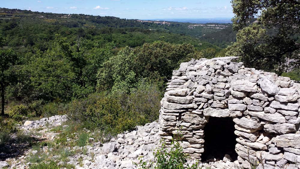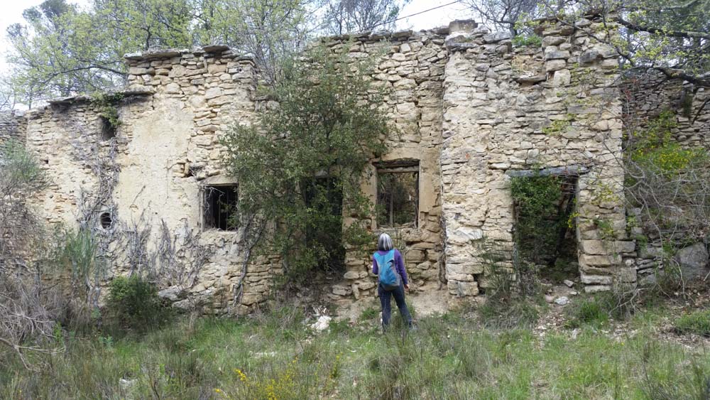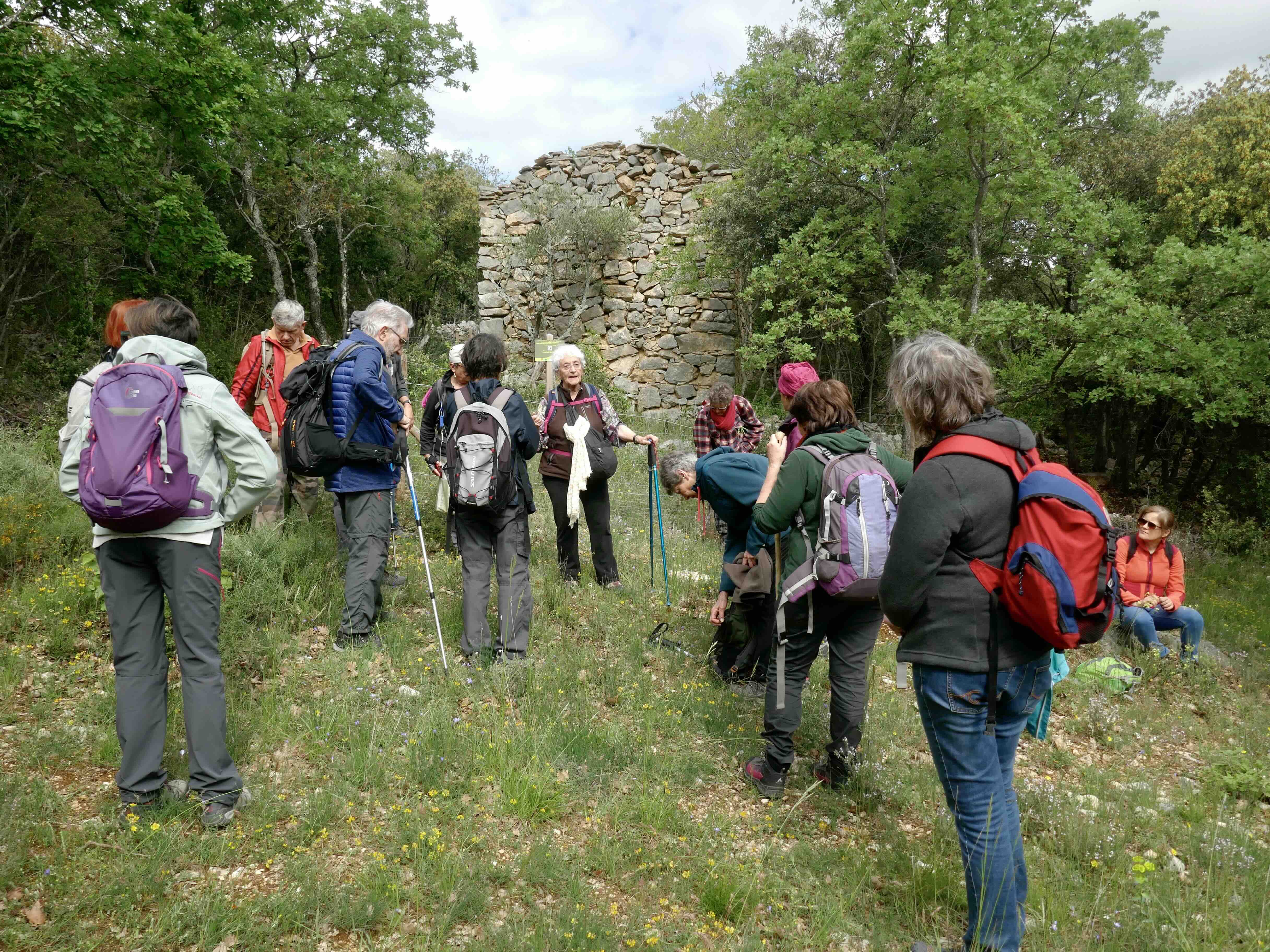 Dans la matinée, nous parcourons un ancien paysage agricole, fait de belles terrasses d’anciennes cultures, principalement d’oliviers, de ruines de fermes, de petites cabanes des champs en pierre sèche, pour arriver à la ferme agro-pastorale de la Pérégrine. Comme toutes les fermes agro-pastorales des Monts de Vaucluse de la fin XVIIIe début du XIXe siècle, elle est entourée de murs protecteurs, abrite une grande citerne couverte et un bassin pour abreuver les moutons. Propriété de la commune de Venasque, elle est actuellement un « hôtel » dédié à abriter des chauves-souris de toutes espèces.