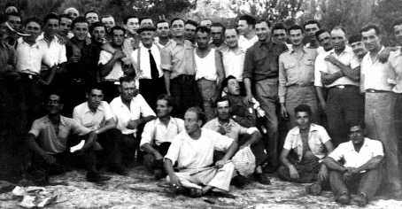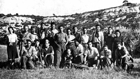 Photographie d’une partie du Groupe-Franc KLEBER au Maquis du Chat en août 1944 (Légende d’après H. VICARI, 2014)