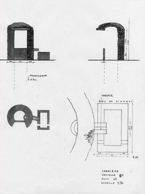 Cuves, bassins et citernes (Type 7) pour conserver l’eau ou le vin. Les aiguiers sont des citernes qui peuvent être couvertes d’une voûte en pierres pour garantir la qualité de l’eau en maintenant des températures fraîches, en empêchant l’évaporation et en évitant que les animaux ne s’y noient. Les cuves vinaires sont des citernes creusées dans la roche pour la fabrication du vin. Les cuves à vin blanc comportent un petit fouloir pour ne laisser que le jus dans la cuve, au contraire du vin rouge où on laissait la grappe.
