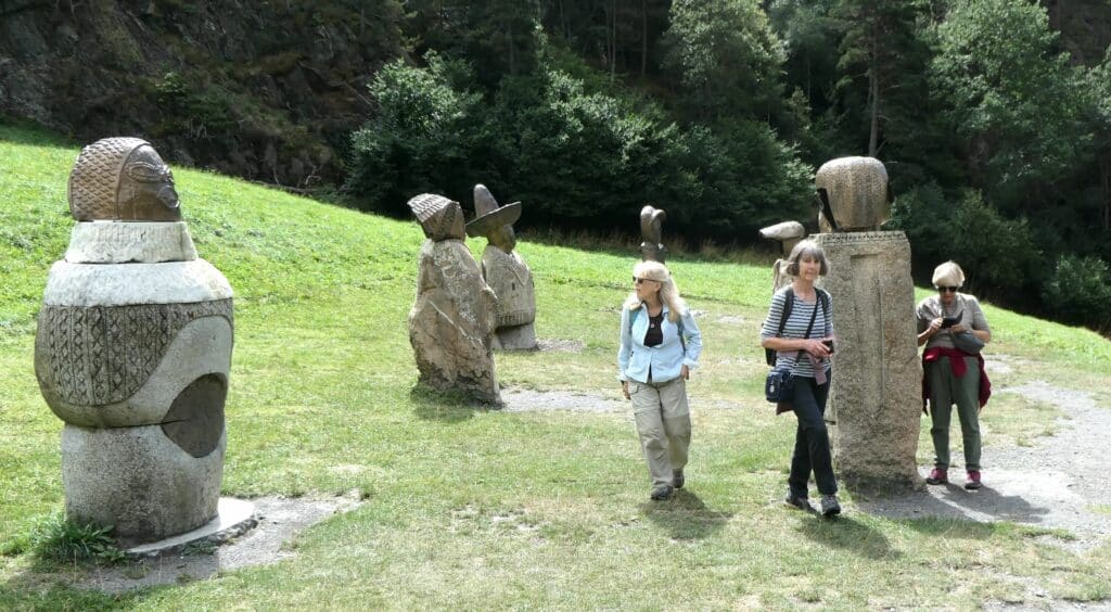 Cyrille nous a guidés à la découverte des maisons et des aménagements de la Ruta del Ferro dans la vallée d’Ordino entre Llorts et El Serrat, dont les personnages de la Familia Jordino de Rachid Kimoune (ci-dessous).